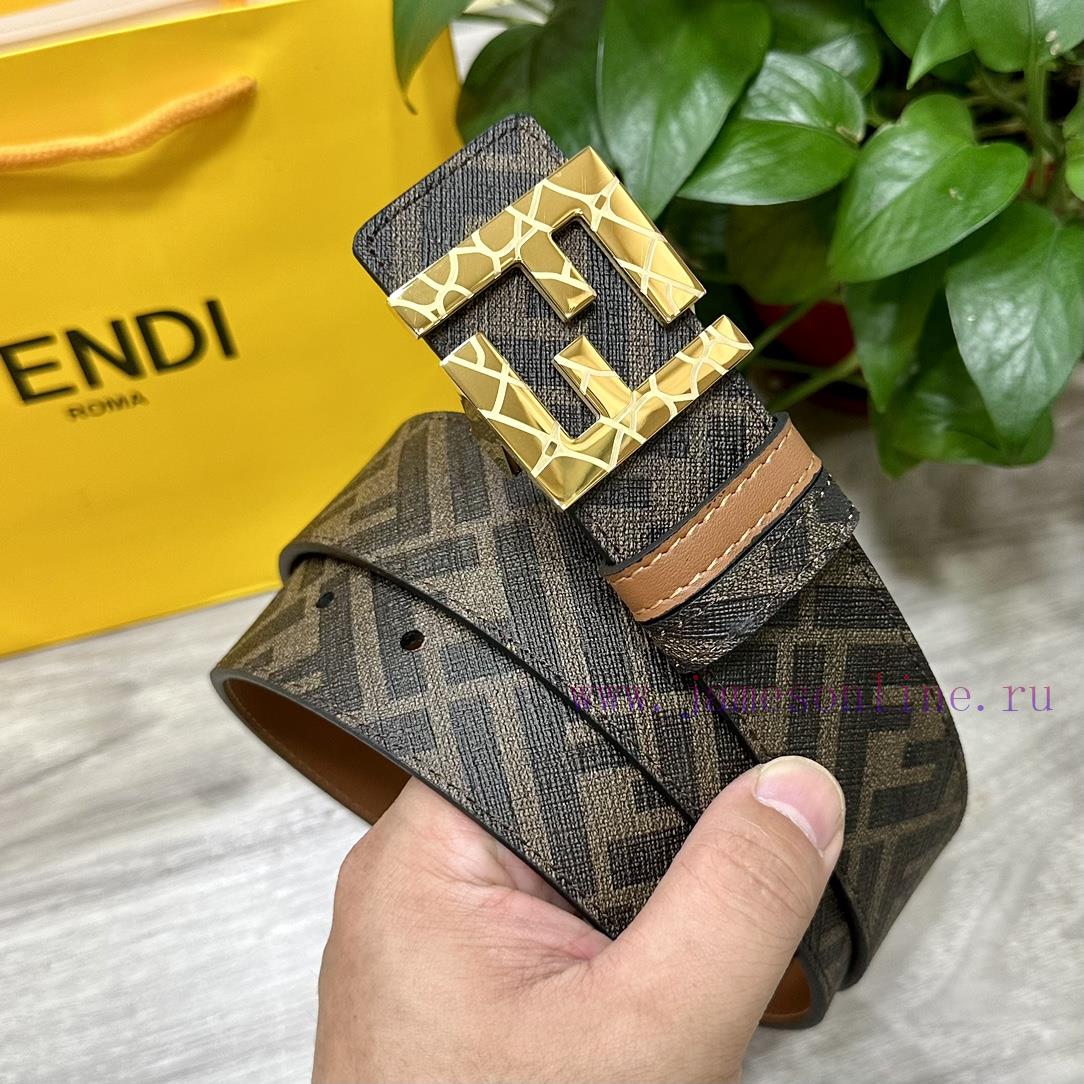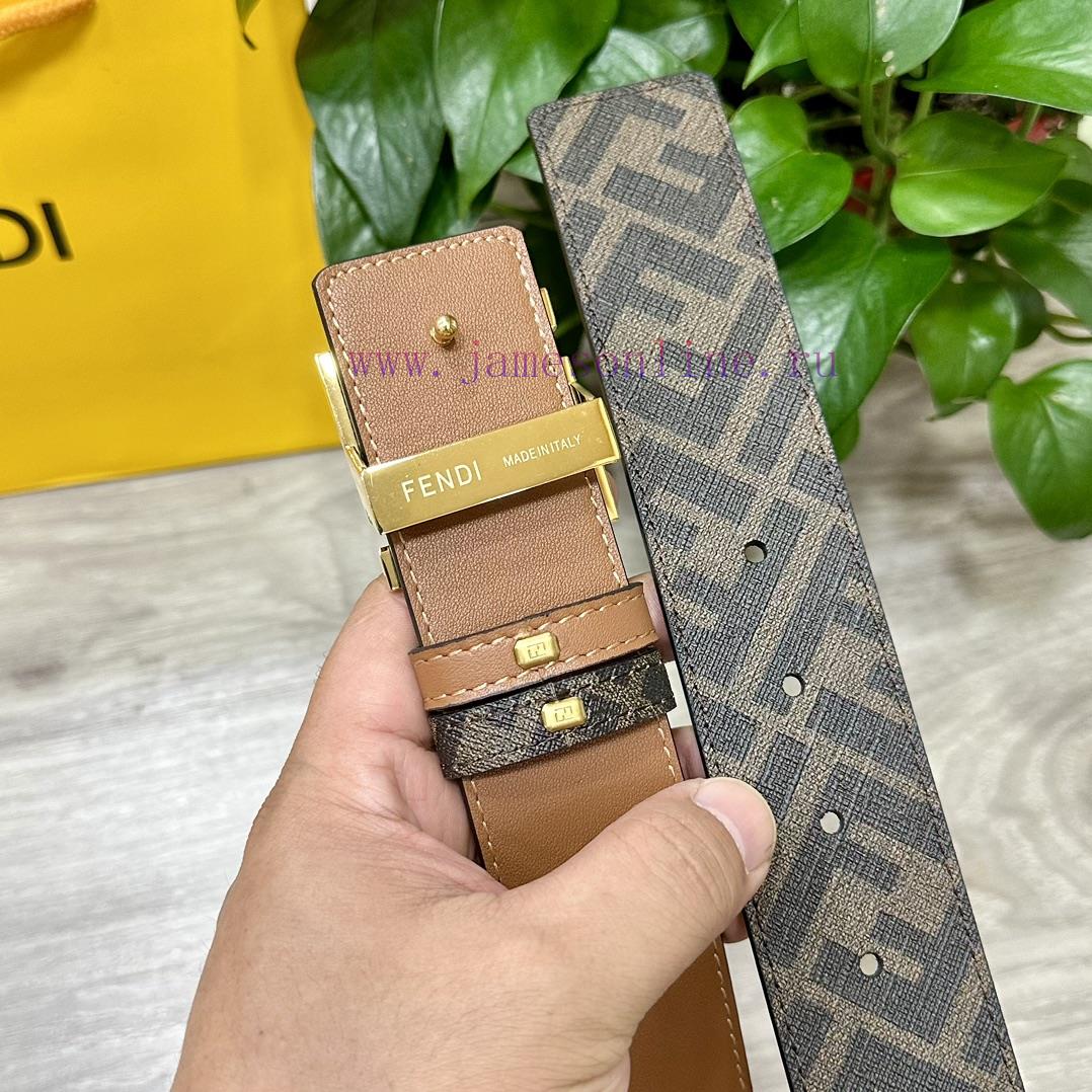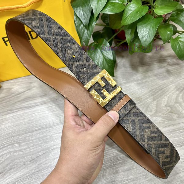 (Image+10)FENDI style, width 4.0CM, double ring front and back waist belt with FF nail buckle, earth yellow Cuoio Romano leather material, back fabric with tobacco yellow and black FF pattern, square metal finish, fashionable, classic and versatile