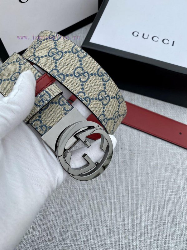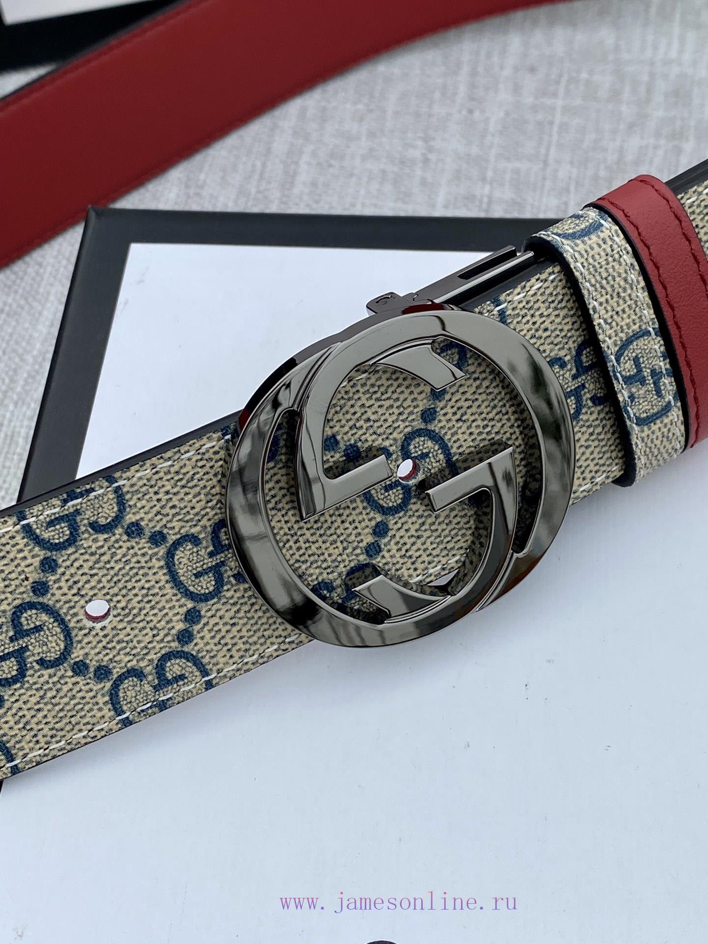 Width 4.0cm Gucci double-sided belt, with GG Supreme canvas on one side and jujube red top calf leather on the other side, paired with interlocking double G rotating buckle heads that are vacuum electroplated/
